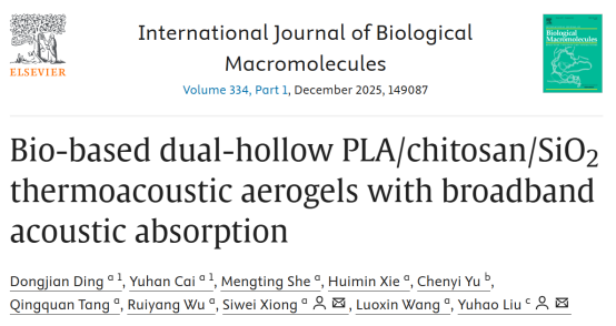 PLA/SiO2复合气凝胶在热学和声学性能上展现出卓越的多功能集成特性,其独特的双中空结构不仅实现了超低导热系数,还赋予了材料宽频域的高效吸声能力。这种“隔热-吸声”一体化特性,使其能够同步解决建筑与交通领域面临的热管理失效与噪声污染问题。其优异的性能不仅保障了应用环境的舒适与安全,独特的生物可降解性更确保了材料生命周期的环境友好性,为绿色可持续发展提供了创新的材料解决方案。