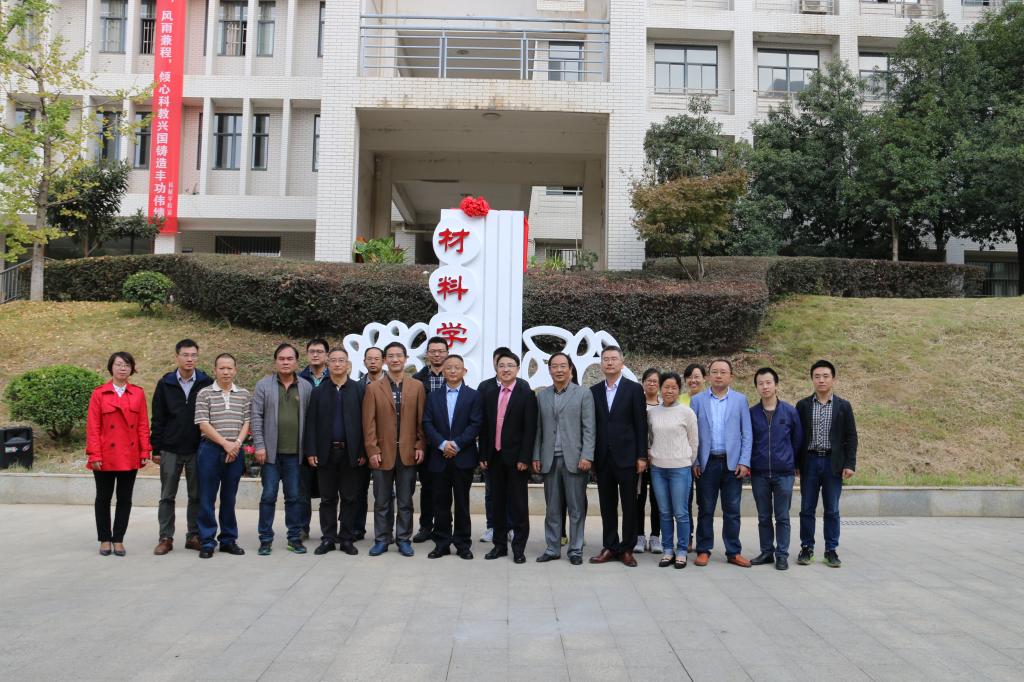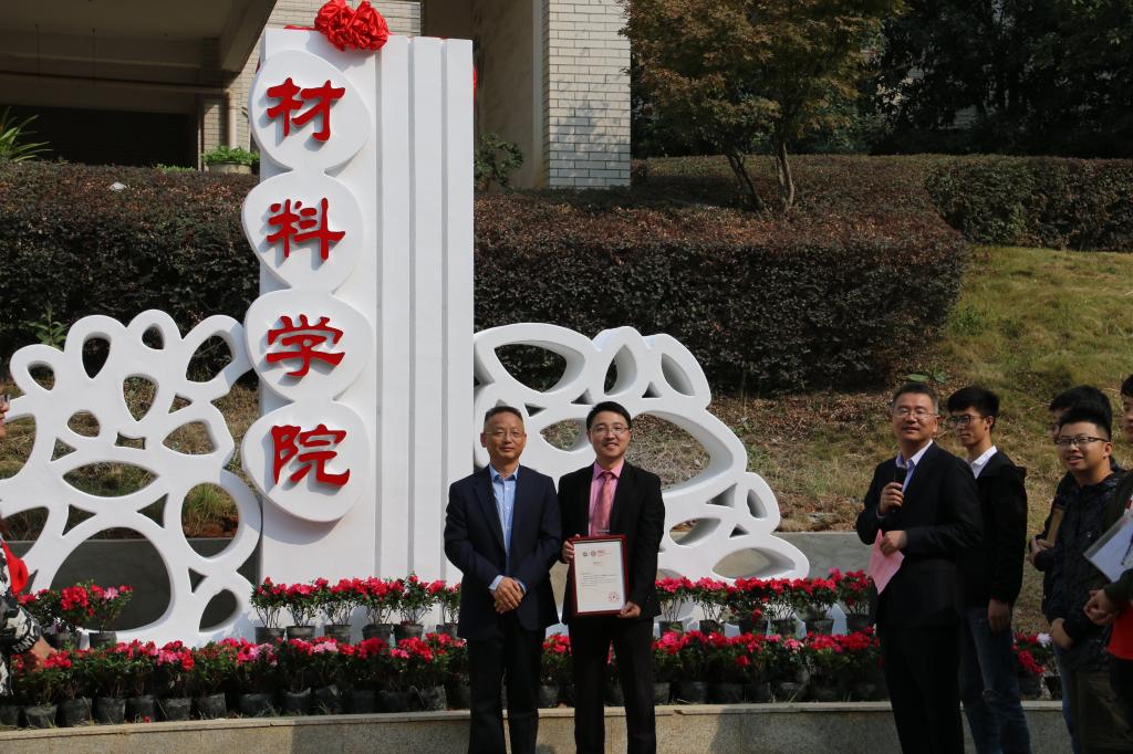 教职工在院名牌前合影留念。