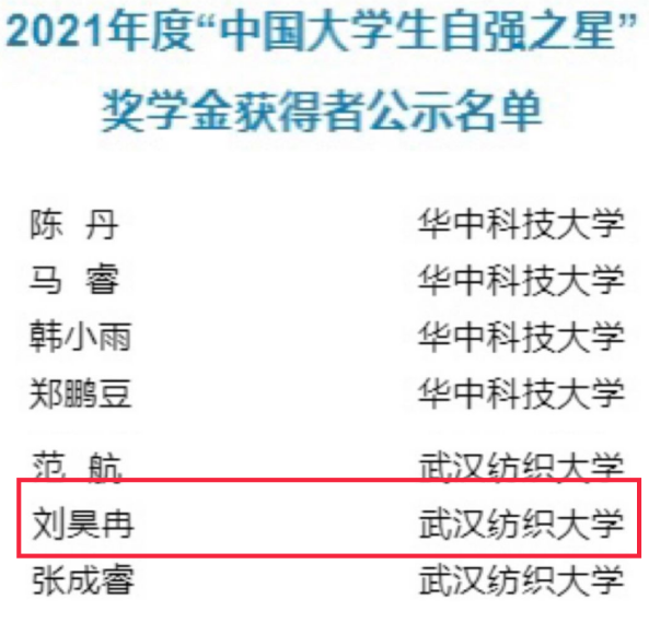2019级本科生刘昊冉(社区实践类)荣获2021年度“中国大学生自强之星”奖学金。