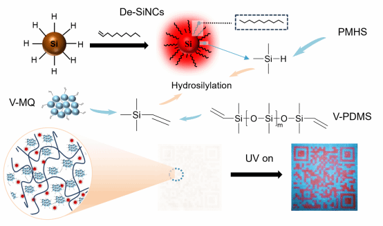 图1 硅纳米晶的合成及MQ硅树脂增强的PDMS荧光耐老化防伪涂层的制备机理图
