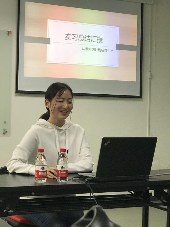 接着,葡京娱乐场 优秀实习生代表杨瑞华同学从实习之路、实习感想、实习收获、就业方向、职业能力展现、职业价值观、职业规划等七个方面对本次的实习做出了自己的总结。她说,通过此次实习,他们对服装面料从原料切片短纤生产到针/梭织面料的织染、后整理再到成衣的生产制造的流程都有清晰地认识,培养了自身独立思考和解决问题的能力,通过五个月与企业“亲密接触”的机会,同学们基本确定了各自的就业方向。