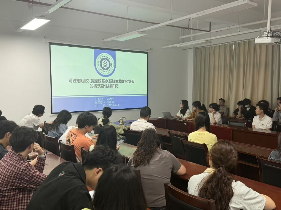 刘诗瑶同学以《可注射明胶-黄原胶基水凝胶生物矿化支架的构筑及性能研究》为题进行汇报。通过化学修饰和光交联技术,成功构建了兼具高机械强度、生物相容性和药物缓释功能的水凝胶。该水凝胶在7天内可形成羟基磷灰石矿化层,矿物含量达50.8%,接近天然骨成分,并能实现环丙沙星盐酸盐的24小时缓释,有望用于骨组织修复。