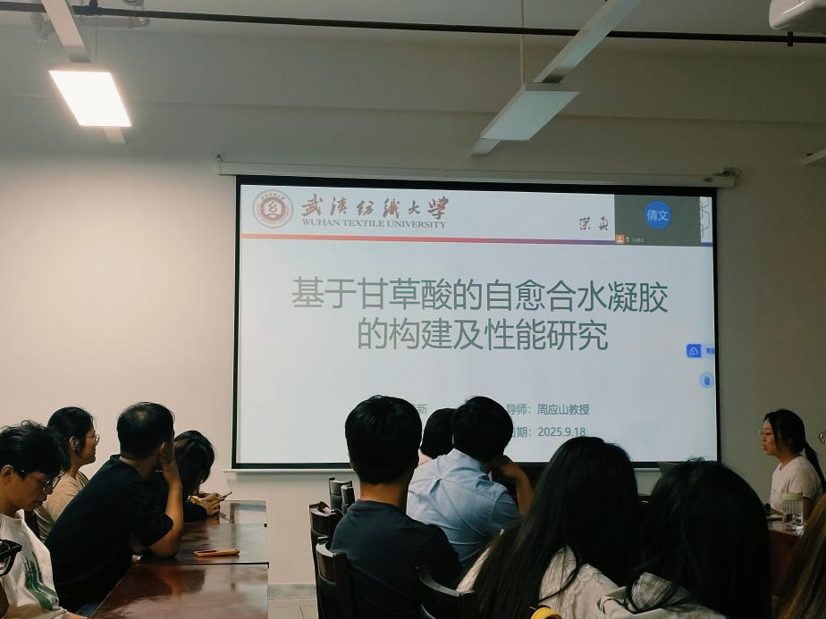 胡雅新同学汇报了《基于甘草酸构建的自愈合水凝胶的制备及其性能研究》,围绕天然产物甘草酸的结构特性,设计并构建了一系列具有多重动态键(如酰腙键、硼酸酯键、亚胺键等)的自愈合水凝胶体系。研究通过改性甘草酸与氧化透明质酸、聚乙烯醇、壳聚糖等高分子交联,成功制备出具备优异力学性能、自愈合能力和生物相容性的水凝胶材料。实验结果显示,部分体系在1小时内可实现100%应力恢复,具备良好的可注射性和自由基清除能力,在创伤修复、药物载体等生物医药领域展现出广阔应用前景。