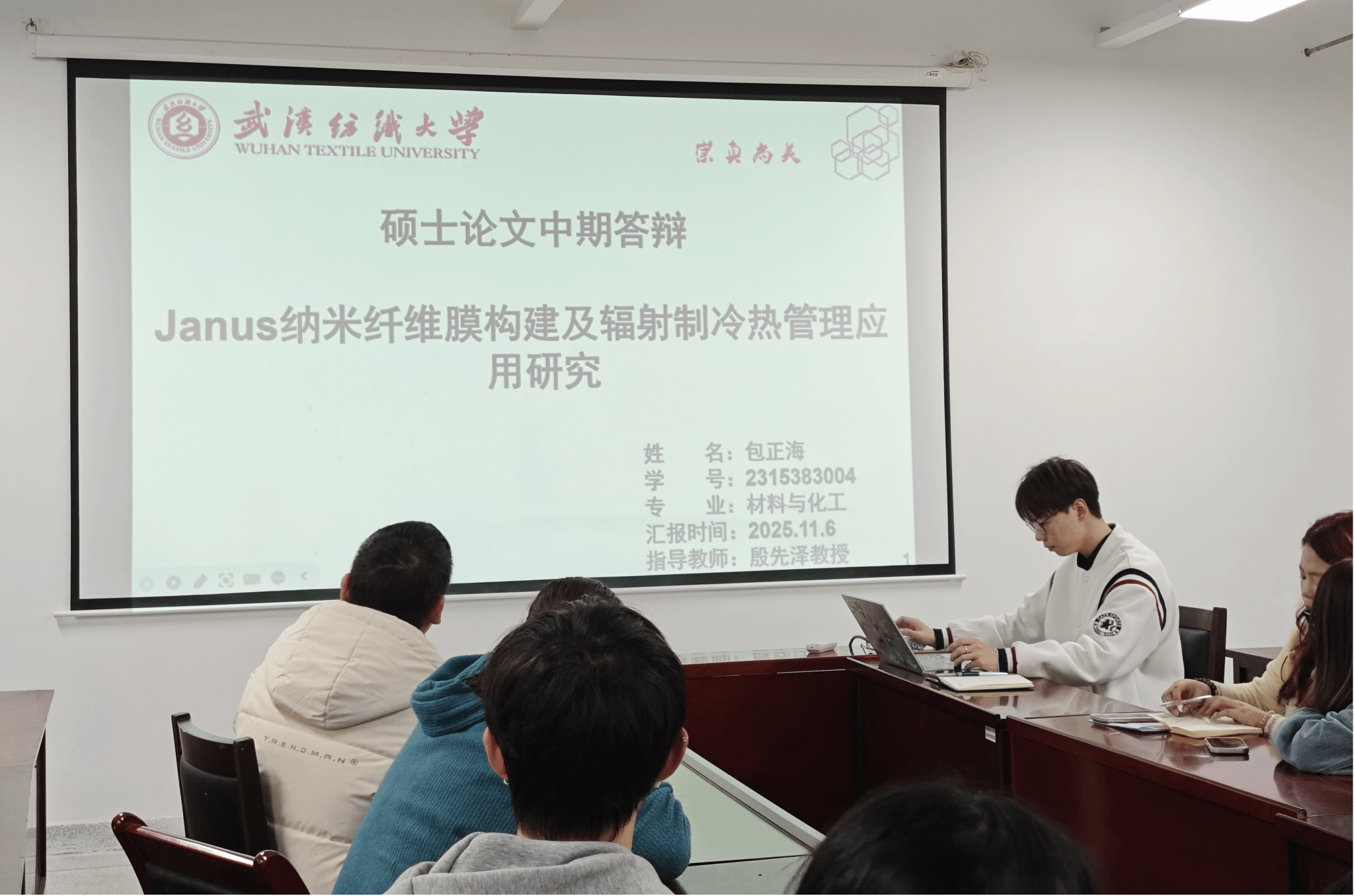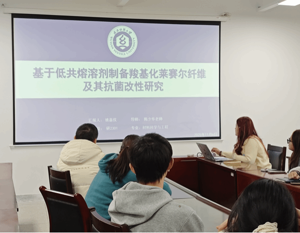 硕士研究生包正海、贺嘉欣、姚嘉仪三位同学分别围绕辐射制冷织物、PVDF膜亲水化改性、羧基化莱赛尔纤维抗菌功能化三大研究方向进行了精彩的学术汇报,集中展示了葡京娱乐场