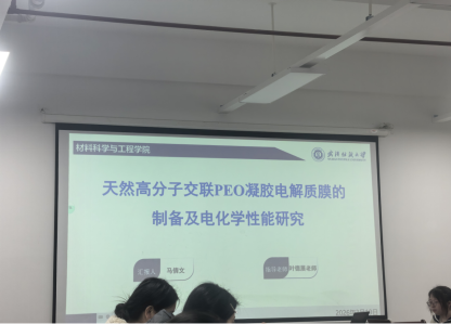马倩文同学的汇报题为《天然高分子交联 PEO 凝胶电解质膜的制备及电化学性能研究》,聚焦电动汽车电池电解质的安全与性能难题。该研究以聚环氧乙烷(PEO)为基础聚合物基体,首次将木质素等天然高分子进行接枝改性,通过热压聚合技术制备天然高分子交联 PEO 复合凝胶电解质膜。研究通过分子设计优化,成功破坏了 PEO 的结晶结构,构建了三维机械支撑网络,有效抑制锂枝晶生长,优化了 Li + 传输路径。实验结果表明,改性后的凝胶电解质膜离子电导率、锂离子迁移数显著提升,分解电位更高,吸液率和热稳定性也得到改善,实现了力学性能与电化学性能的协同提升。