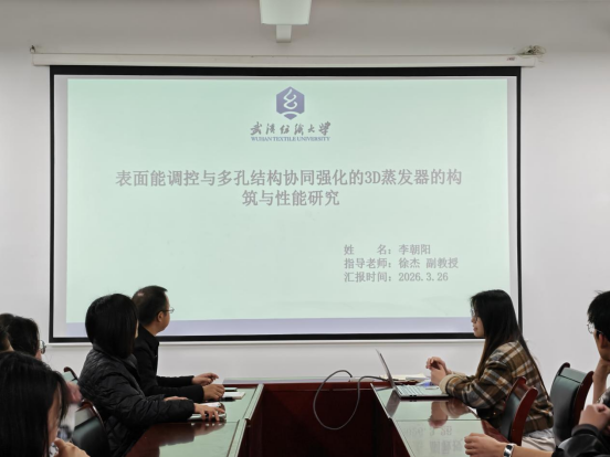 李朝阳同学汇报了《表面能调控与多孔结构协同强化的 3D 蒸发器的构筑与性能研究》。他针对界面太阳能蒸发中 “亲水 - 高表面能” 的矛盾,创新性地提出协同设计策略,结合 3D 结构、水分子状态以及表面能调控,构建了一种亲水 / 疏水复合材料,实现了 “水输运 - 汽化 - 扩散” 全过程的协同强化。该材料具有优异的光热转换性能、抗盐性和长期稳定性,在实际户外应用中展现出巨大潜力,为解决全球水资源短缺问题提供了新的技术路径。