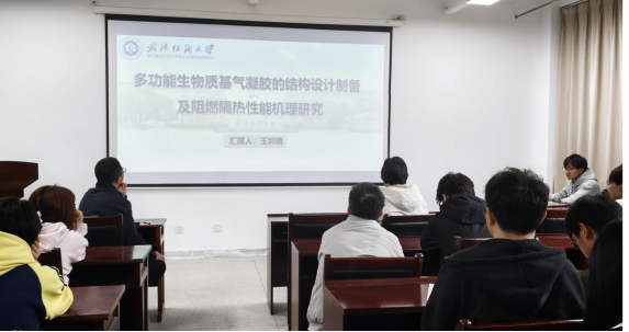 王圳楠同学汇报了《多功能生物质基气凝胶的结构设计制备及阻燃隔热性能机理研究》。针对传统石油基保温材料不可降解、易燃有毒等痛点,他提出全生物基+双网络增强创新路线:以海藻酸钠为基体、单宁酸为分子胶水、植酸铵为阻燃相,通过定向冷冻构筑层状多孔结构,实现LOI>60%、UL-94V-0级阻燃与低导热系数(~0.040W/m・K);进一步引入MXene与聚乙烯醇构建双网络互穿结构,赋予气凝胶高强韧、电磁屏蔽、疏水耐候多功能特性,成功实现阻燃+隔热+屏蔽+防水一体化,为绿色建筑、高端保温提供安全环保新材料方案。