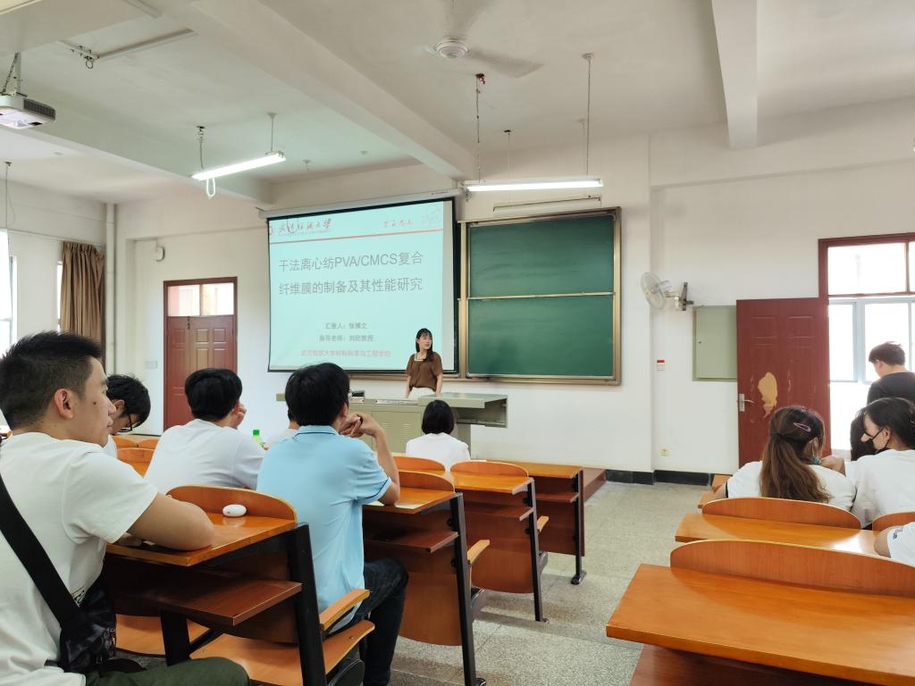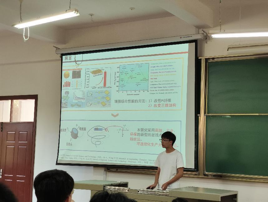 全体研究生作以“离心纺制备聚酰亚胺纤维纸及其绝缘性能研究”、“ZrO2/Si-C-O多相柔性陶瓷纳米纤维的制备和性能研究”和“干法离心纺PVA/CMCS复合纤维膜的制备及其性能研究”为主题的三场报告。