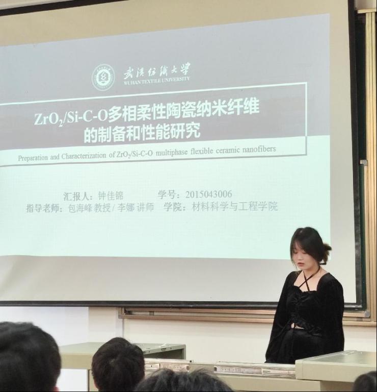 随后,钟佳锦同学介绍了ZrO2/Si-C-O多相柔性陶瓷纳米纤维的制备,选择ZrO2作为镐原的原因是其高熔点(2650℃)、耐腐蚀抗氧化、低固体热导率,相较于近期研究内容,钟同学介绍采用了静电纺丝技术使陶瓷纤维晶型发生改变,提高其热稳定性与柔韧性,以及实验原理部分的讨论。