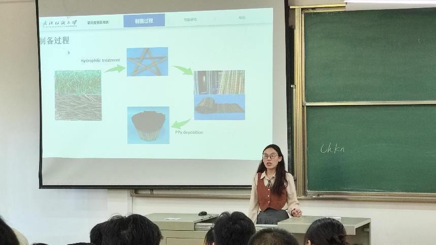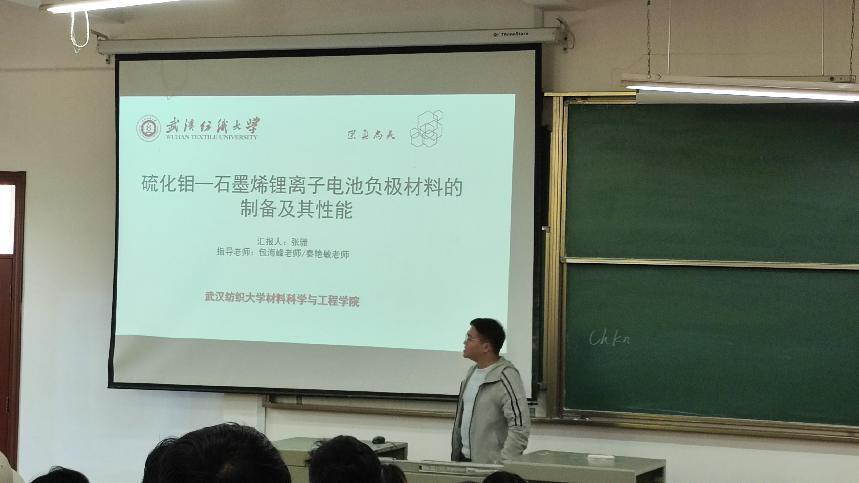 全体研究生作以“PPy@HCL竹简式太阳能光热蒸发器”、“Polylactic acid scaffold with directional porous structure for large-segment bone repair”和“硫化钼复合石墨烯锂电子电池负极材料的制备及其性能”为主题的三场专题报告。
