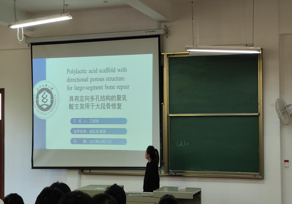 随后,王朝荣同学介绍了具有定向多孔结构的聚乳酸支架在大段骨修复中的应用,PLA是一种良好的生物相容性,可降解的聚合物材料,且具有良好的芯吸能力,利于细胞向内部的迁移。并谈到了一般制备方法以及实验部分如何制备和表征结果的讨论。