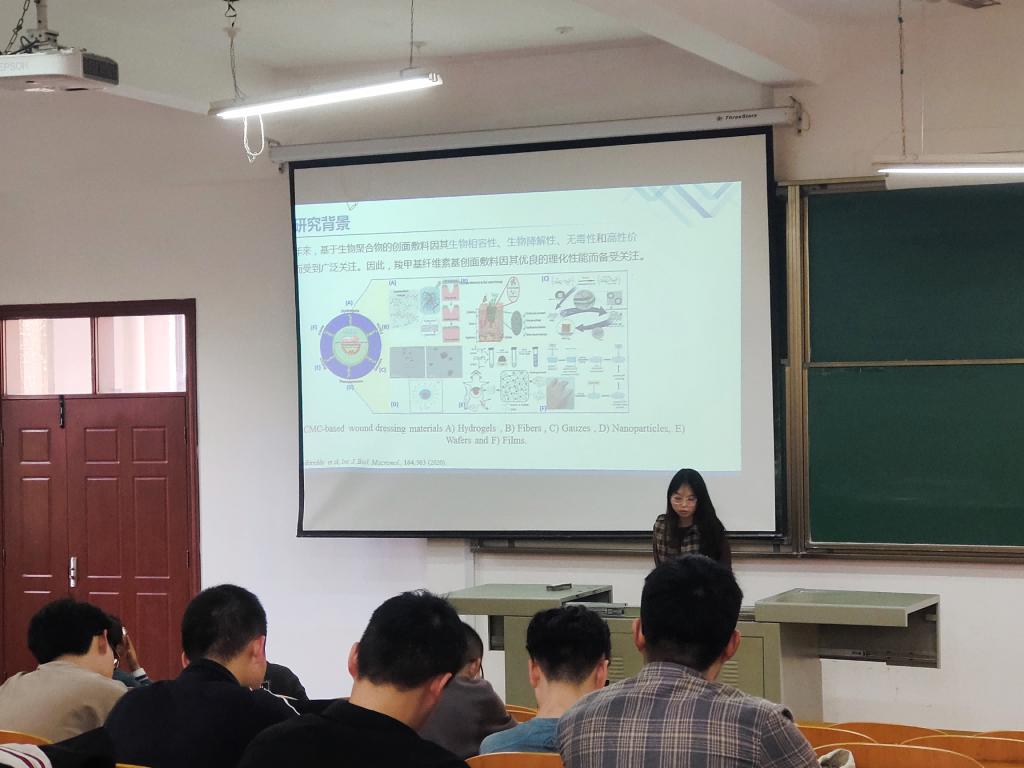 最后一个同学张佳贝介绍了用于伤口敷料的壳聚糖/纳米银改性羧甲基粘胶纤维的制备及其抗菌性能的相关内容,向同学们介绍到伤口敷料中的无机抗菌剂是银、铜、锌的离子形式及其金属化合物。其中银的使用最为广泛。并讲解了抗菌羧甲基粘胶纤维的具体制备过程,注意事项以及产品的各种实验数据,实验表征等。最后介绍到目前实验研究得出的初步结论:改性羧甲基粘胶纤维的吸液量和保液量随着取代度的升高而增大。