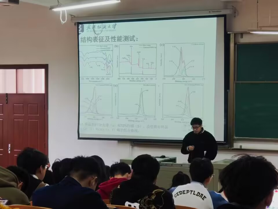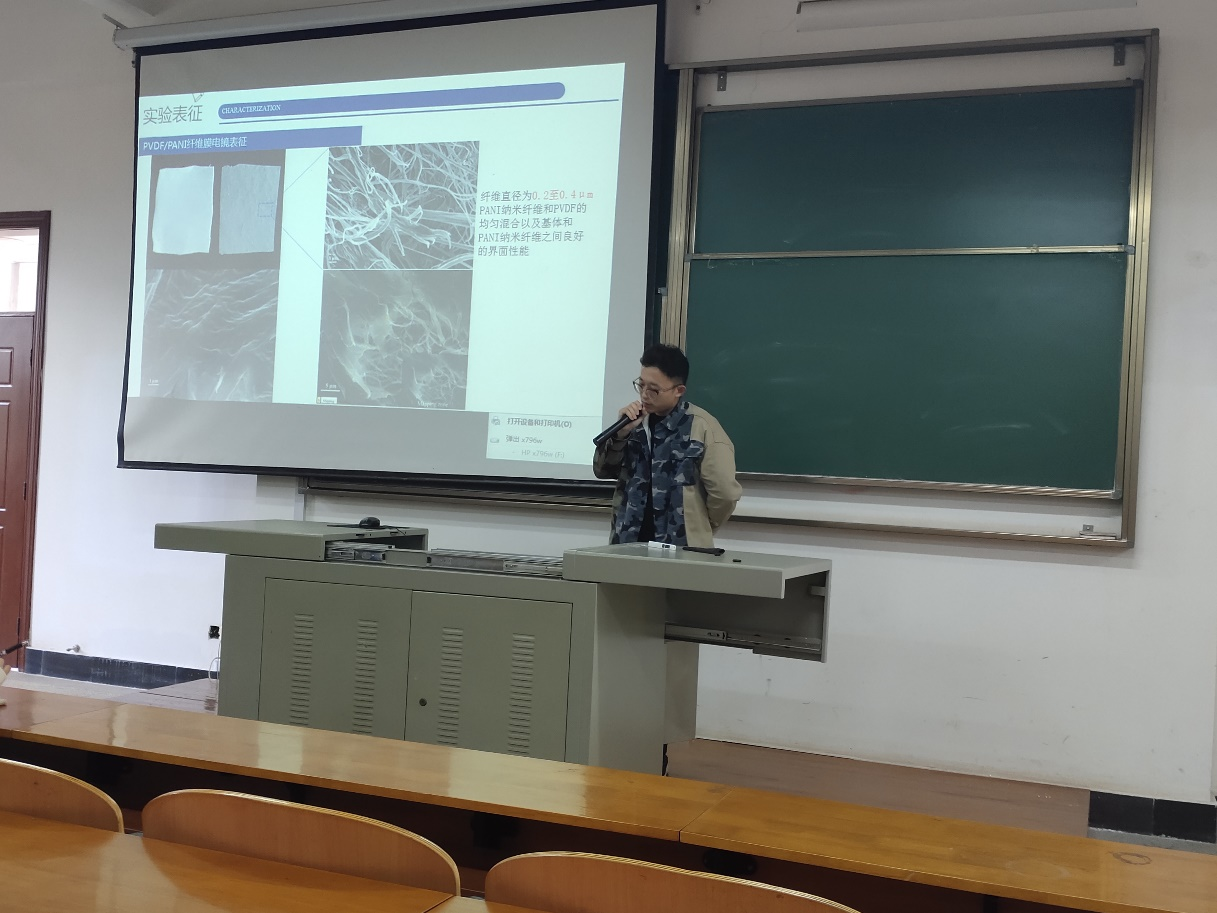 第一位汇报人周玮杰报告了一种新的室温加工策略,通过SBS和冷压的结合,生产出具有良好介电和机械性能的极性相优先的PVDF/PAN纳米纤维薄膜,并指出这种高效的室温工艺具有降低能耗和改善介电性能的优点,在工业应用中具有很大的潜力。