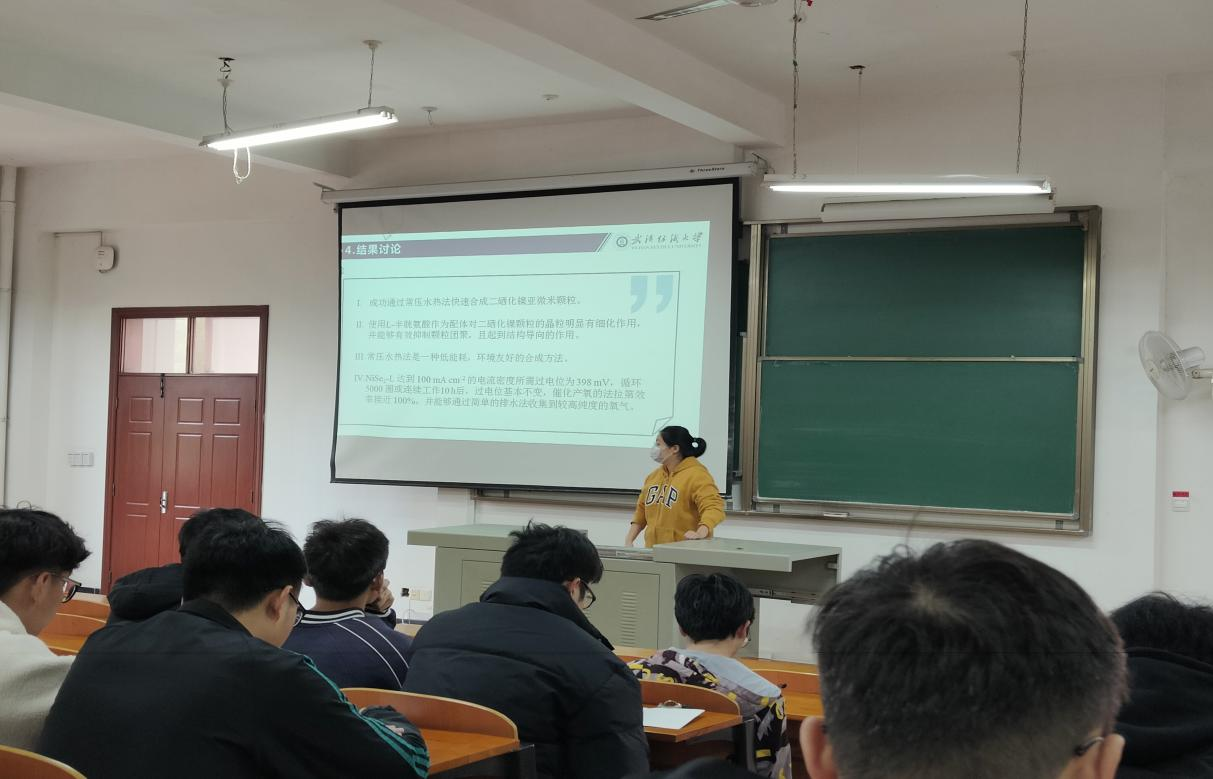 全体研究生作以“常压水热法简易合成二硒化镍颗粒用于碱性析氧反应”、“表面功能化纤维膜用于细菌特异性、快速、高灵敏检测研究”和“纳米纤维基高效杀菌抗病毒空气过滤材料的制备及性能研究”为主题的三场专题报告。
