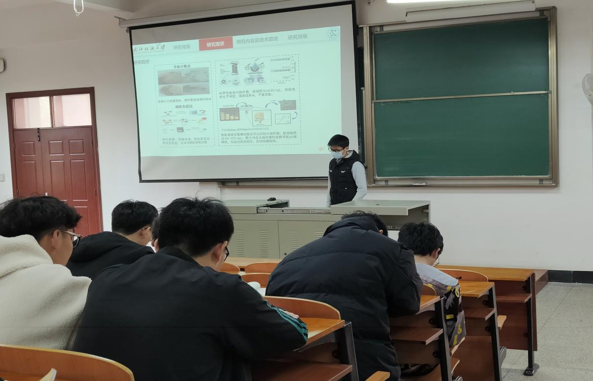 随后,万华坤同学介绍了表面功能化纤维膜用于细菌特异性、快速、高灵敏检测目前的研究现状:目前,食品安全越来越受到重视,很多食品可能都会被致病菌污染,进而引起一些“食源性”的致病问题,日常生活中,很多食品可能都会被致病菌污染。常见的致病细菌有大肠杆菌、金黄色葡萄球菌、铜绿假单胞菌等。并详细地介绍了自己的研究内容及技术路线,并详细地谈到了实验过程中所用到的制备方法以及实验部分如何制备样品和最终实验表征结果的讨论。