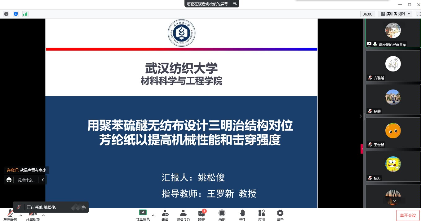 全体研究生作以“3D开放式中空光热蒸发器的开发及性能研究”、“用聚苯硫醚无纺布设计三明治结构对位芳纶纸以提高机械性能和击穿强度”为主题的两场专题报告。