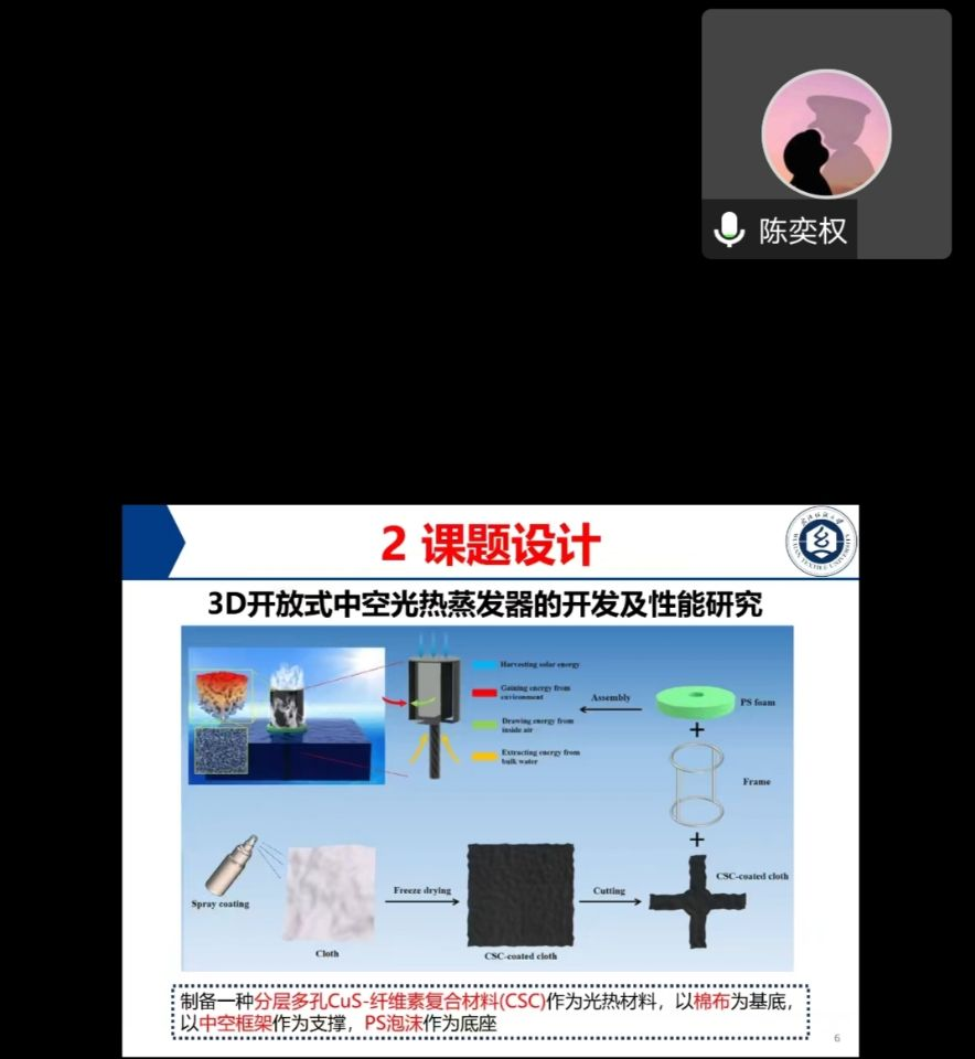 陈奕权同学以介绍了目前的研究意义以及研究现状,表明开发高蒸发速率和高太阳能转换效率、具有优异耐盐性、低材料消耗的太阳能水蒸发器件是未来的发展趋势,然后通过介绍具体制备过程、相组成及形貌分析、表面元素组成介绍、电催化性能表征实验,最终一系列的实验数据分析最终得出通过结构优化制备了一种三维开放式中空光热蒸发器,这种特殊结构能最大限度减少能量损失,并能吸取水体和周围空气的能量,从而实现高效水热发。对比封闭结构,开放中空结构通过引入对流,所以表面实现冷蒸发,能收集更多能量。