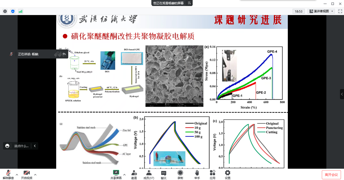 第一位汇报人杨赫介绍了自己的研究内容——锌离子混合电容器新型凝胶电解质的制备与性能研究,通过制备双交联网络超分子凝胶电解质、磺化聚醚醚酮改性共聚物凝胶电解质进行后续的柔性展示,低温性能测试,以达到延长循环使用寿命这一目标。制备的SGPE样品具有非共价键相互作用形成的三维框架充满硫酸锌溶液的分层多孔结构,有利于调节锌沉积,抑制锌枝晶的生长,延长器件循环寿命,采用(高氯酸锌加乙二醇)DES溶液后处理预先制备的磺化聚醚醚酮改性共聚物凝胶电解质,氢键的作用是使其凝固点降低,扩大器件的工作温度范围,这是该课题的创新点所在。
