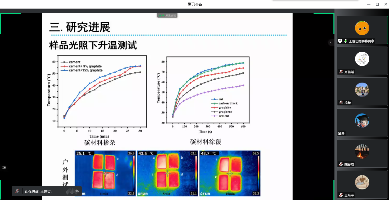 第二位汇报人王世哲对多孔水泥基光热转换材料对水蒸发效率进行了研究,通过研究背景、研究方案、研究进展、研究结论对自己成果进行了汇报。以多孔水泥作为基材,和光热材料结合在一起,利用多孔水泥良好的渗水、蓄水效果和光热材料的光热净化效果制备了多孔水泥基光热转换材料,可以应用于地表和建筑物表面,为解决城市内涝和构建海绵城市提供一个新思路,有很广阔的发展空间。