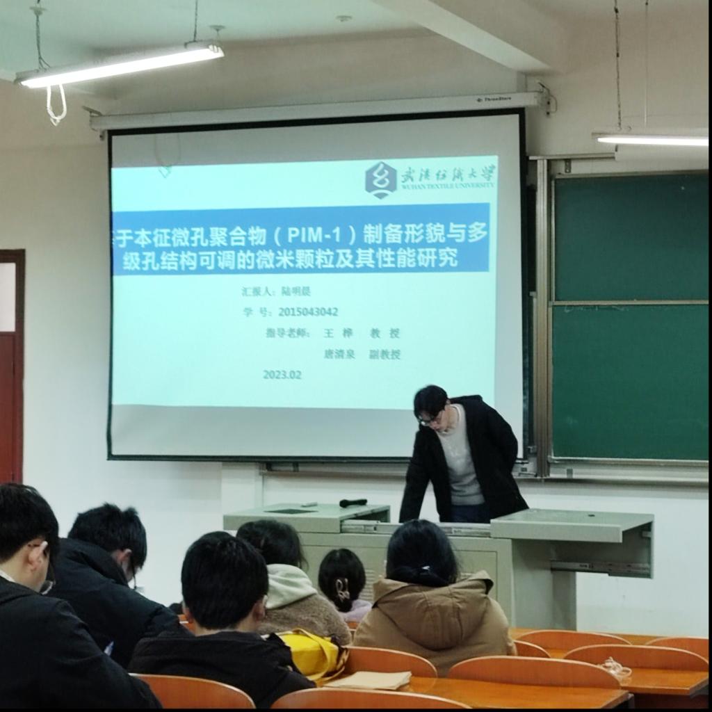 最后陆明晨同学汇报了“以本征微孔聚合物(PIL-1)制备形貌与多级孔结构可调的纳米颗粒及其性能的研究”,主要以介绍多级孔结构的概念,以及如何设计多级孔存在于聚合物同一级结构中,重点介绍了大孔–介孔材料,微孔–介孔材料以及含有多种不同孔径的介孔材料的设计方法。通过简单的方法合成并优化多级材料的制备工艺,降低生产成本,并且获得孔径均一且可控的多级孔材料。
