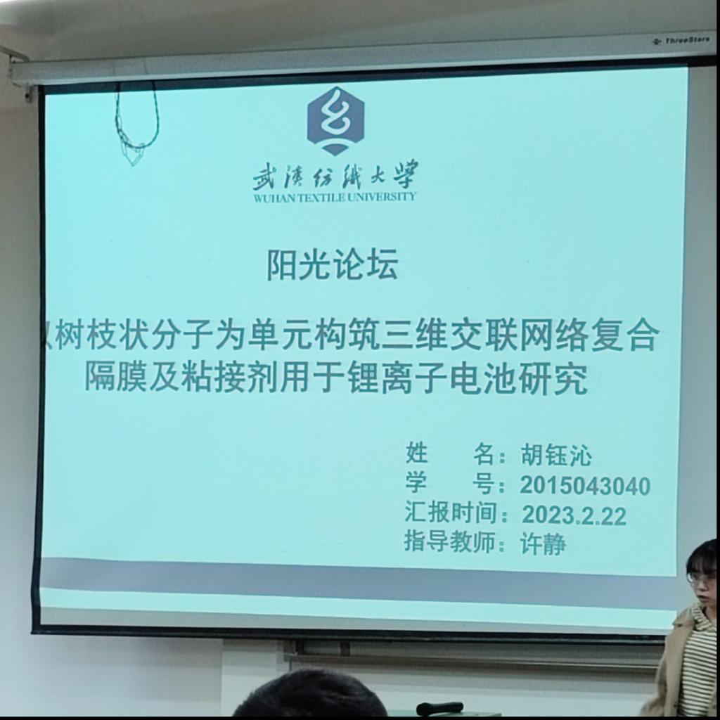 胡钰沁同学汇报了“以树状分子为单位构筑三维交联网络复合隔膜及粘接剂用于锂电子电池研究”,分享了实验背景和设计思路。