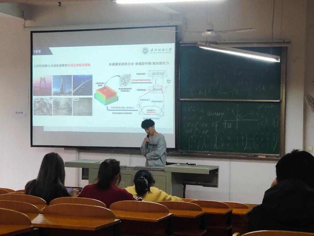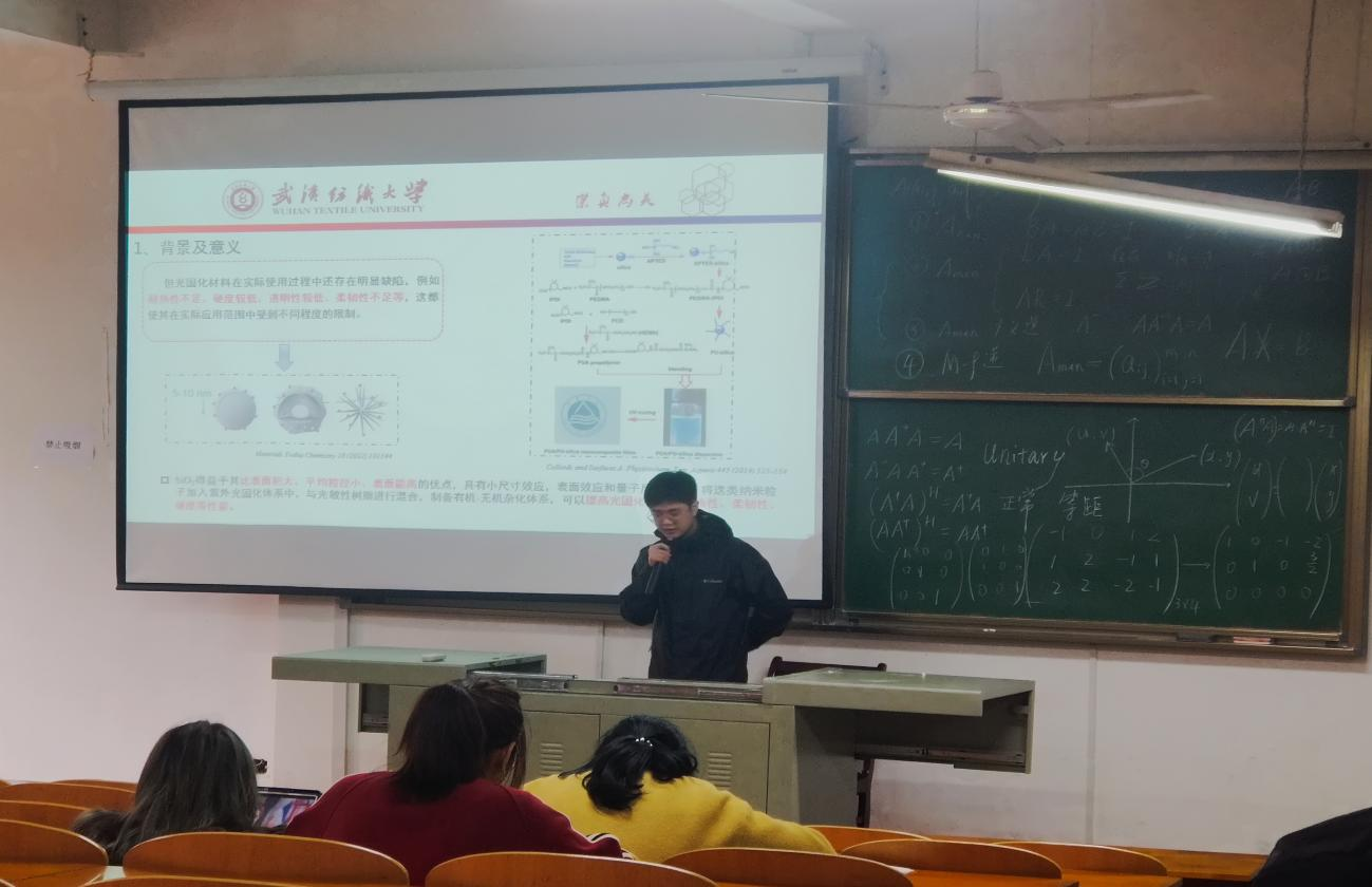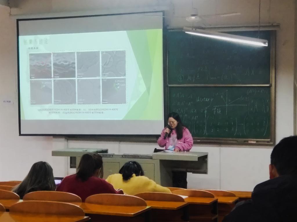 全体研究生作以“热缩型纤维对水泥基复合材料预应力的施加机制及抗裂增韧机理研究”、“光固化聚二甲基硅氧烷复合材料的制备及应用研究”和“KOH活化还原氧化石墨烯/蚕丝短纤维复合薄膜用作超级电容器的柔性电极材料”为主题的报告。