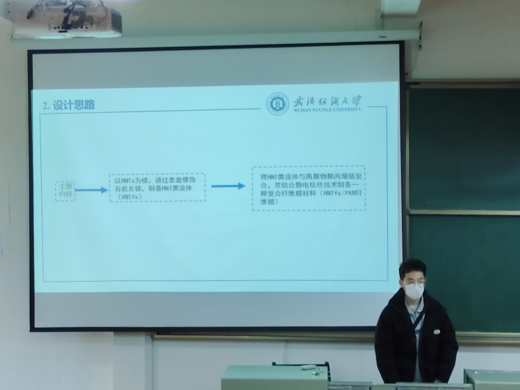 随后,吕烨坤同学以“无机类流体的制备及其复合材料性能研究”为主题。讲解到无机类流体是一种通过纳米颗粒表面改性得到的无机有机杂分子材料,因此他选择了一种比表面积大、结构独特、可用于水处理和气体吸附的具有吸附功能的纳米材料——埃洛石纳米管作为原料,并探究了其复合材料性能。
