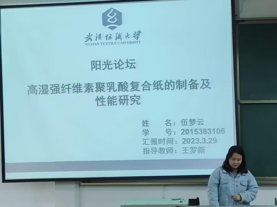 最后,伍梦云同学为大家介绍到由于传统纸张在潮湿环境下,往往会变得脆弱或者容易损坏,这大大限制了纸张的应用范围;而高湿强纤维素纸作为一种新型纸张材料,它可以在潮湿环境下保持稳定性和强度,她便对高湿强纤维素聚乳酸复合纸的制备及其性能进行了研究。最终得到了HSCF/LA复合纸具有良好的水稳定性、热稳定性、可生物降解性以及优异的介电性能等结论。