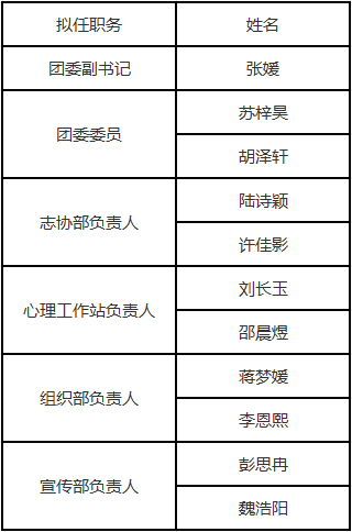 团委第十五届主要学生干部及部门负责人预备人选名单予以公示:(排名不分先后)