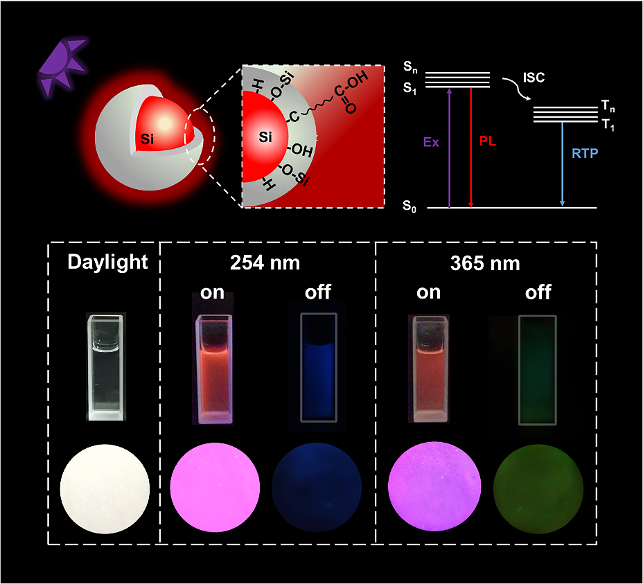硅纳米晶由于其天然丰度高、毒性低、光学性质优异等特点,在许多先进领域受到了广泛关注。然而,大多数研究只关注硅纳米晶的荧光性质,而对其室温磷光及相关应用的研究较少。现有的硅基磷光材料严重依赖于掺杂剂或活化剂,并且磷光在液相环境中由于溶解氧和水的存在容易猝灭,这极大地阻碍了它们的实际应用。因此,开发具有稳定荧光和水分散型室温磷光硅纳米晶仍面临着巨大挑战。