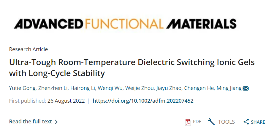姜明副教授团队在热响应介电材料领域的重要进展,相关工作以“Ultra-Tough Room-Temperature Dielectric Switching Ionic Gels with Long-Cycle Stability”为题发表在Advanced Functional Materials(DOI://doi.org/10.1002/adfm.202207452)。武汉纺织大学为该论文的第一署名单位。