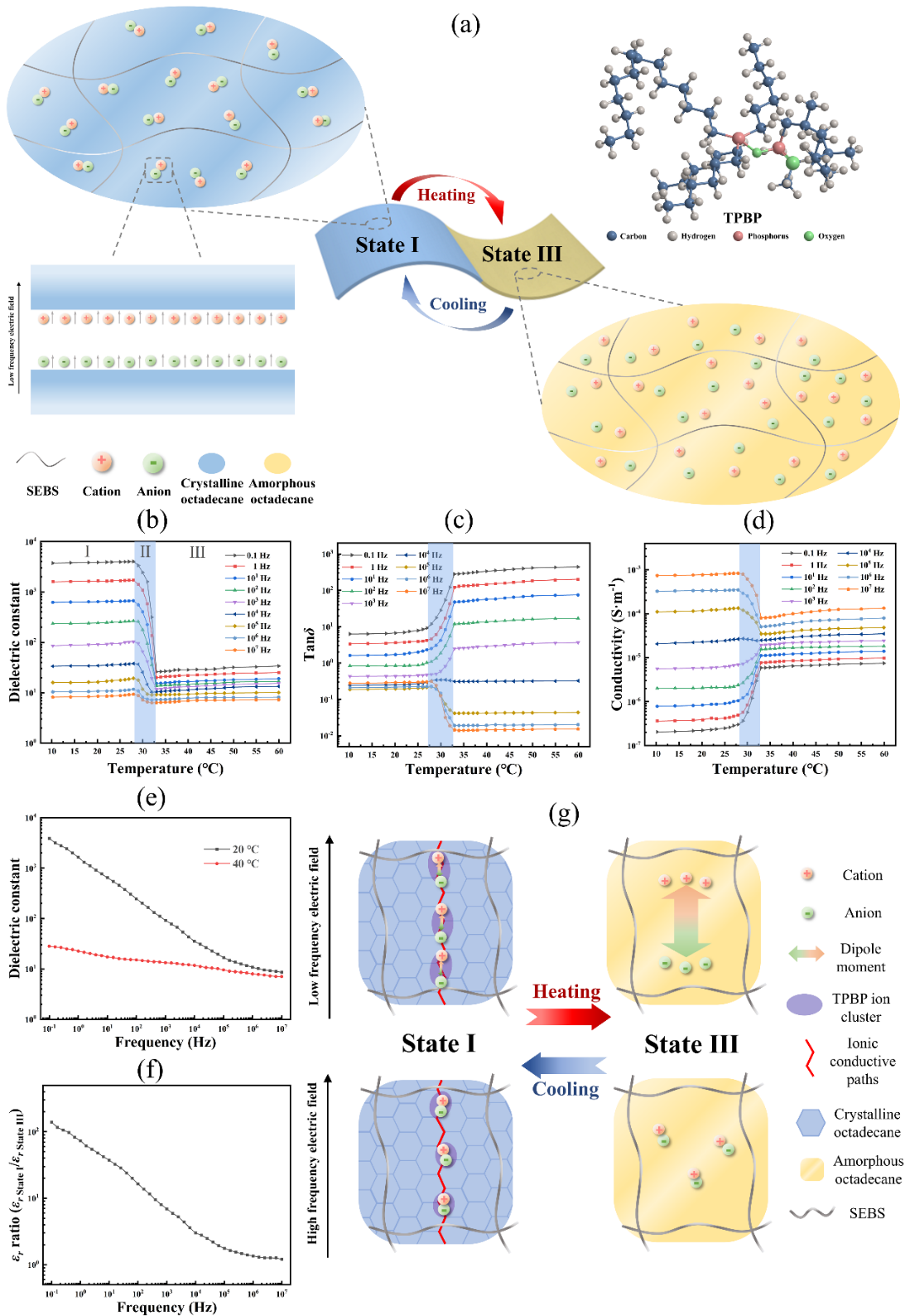 作为下一代智能电子传感设备的关键材料之一,当前热响应介电材料面临两个关键挑战:机械韧性不足以及缺乏高介电开关比、良好的机械性能和长循环稳定性的有机结合。在此,姜明团队提出了一种新的可扩展策略,用于设计新型热响应介电开关材料,该凝胶材料基于一种首次被提出的双介电开关机理,同时将各种特性(例如有高室温介电开关比、出色的机械性能和良好的高低温循环稳定性)集成到一种凝胶中。界面结构演化诱导的双介电开关机制使得离子凝胶可以轻松实现显著的可逆介电双稳态、高于150的高介电开关比、~15 °C 宽的热滞回线、可调节的室温介电转变行为、优异的延展性、理想的高机械强度以及 1000 次以上的高循环稳定性。