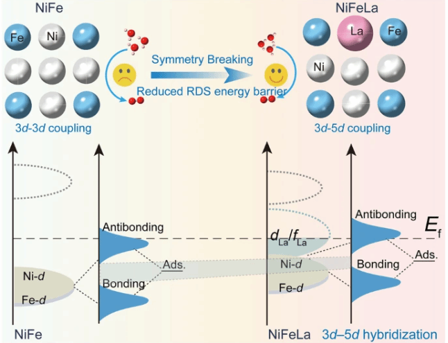本工作通过在NiFe基催化剂中引入第三种金属元素构建不对称的M-NiFe单元,调控d轨道和电子结构。第三元素的引入引起NiFe的d轨道和电子结构的扰动,使得反应中心金属位点的轨道结构微调,从而在OER过程中NiFeM的d轨道和吸附氧的2p轨道之间产生不同程度的杂化。实验结果表明,La原子掺杂到NiFe中可以破坏Ni-Fe单元的对称性,从而通过3d-5d轨道耦合精确调节活性位点的d轨道,调节OER中间体的吸附能,提高催化活性(图1)。DFT计算进一步表明,La原子的引入破坏了Ni-Fe单元的对称性,有助于构建梯度3d-5d轨道耦合的Ni/Fe-M不对称几何结构,这影响了催化剂表面金属位点与OER过程中的含氧中间体之间的d-p轨道杂化(图2)。