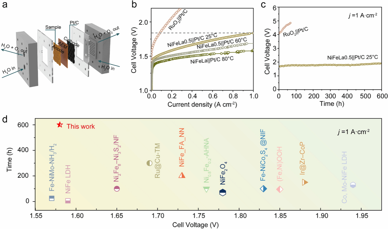 图3. NiFe基催化剂的AEMWE性能。