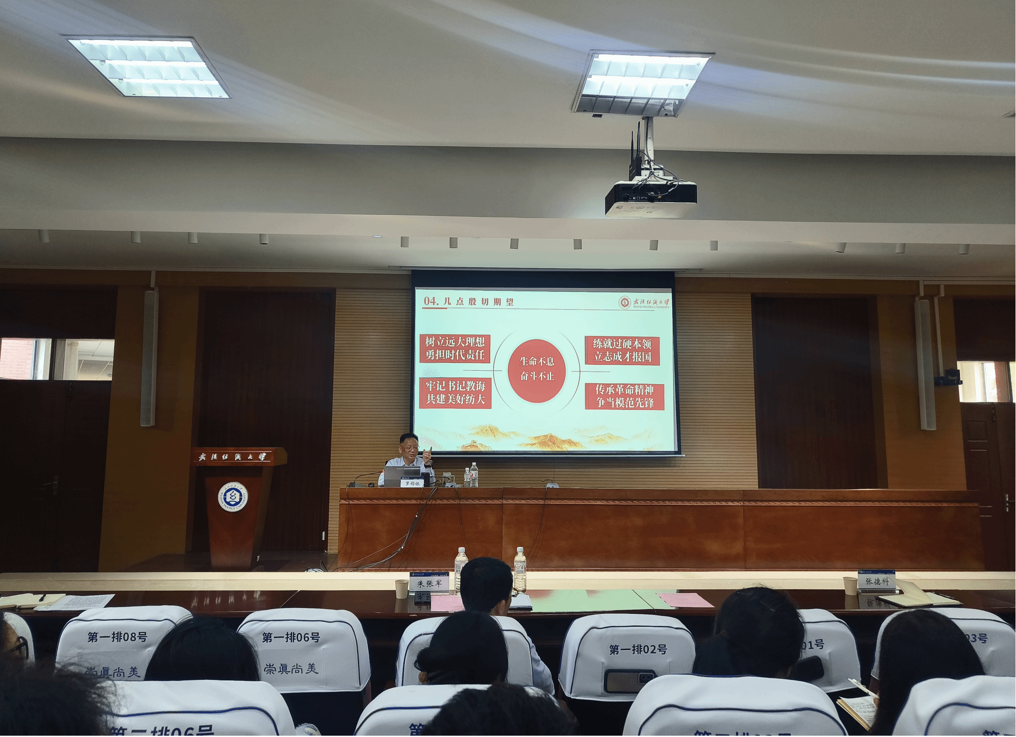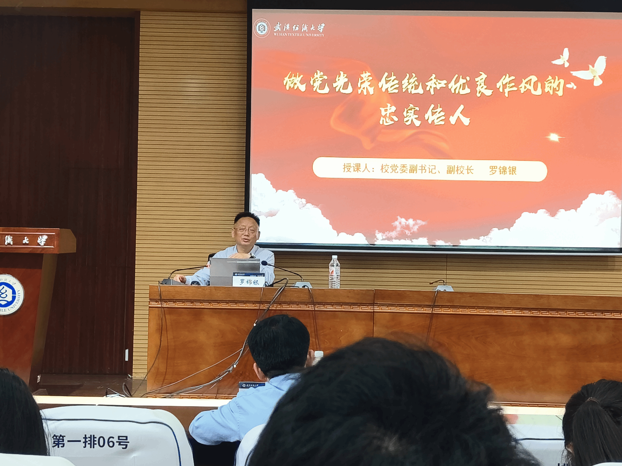 会上,罗锦银还同大家分享了他的原创歌曲《纺大年华》,并同大家一起观看了该首歌曲MV,他寄语同学们要以徐卫林院士为榜样,将荣校爱校的意识融入行动中去,希望同学们练就过硬本领,立志成才报国,做有理想、敢担当、能吃苦、肯奋斗的纺大好青年。时刻以党员的标准要求自己,养成良好的学习习惯,当好先锋,积极展现青年大学生的风采,发挥平常时候看的出来、关键时候站得出来、危难关头豁得出来的学生党员的先锋模范作用。