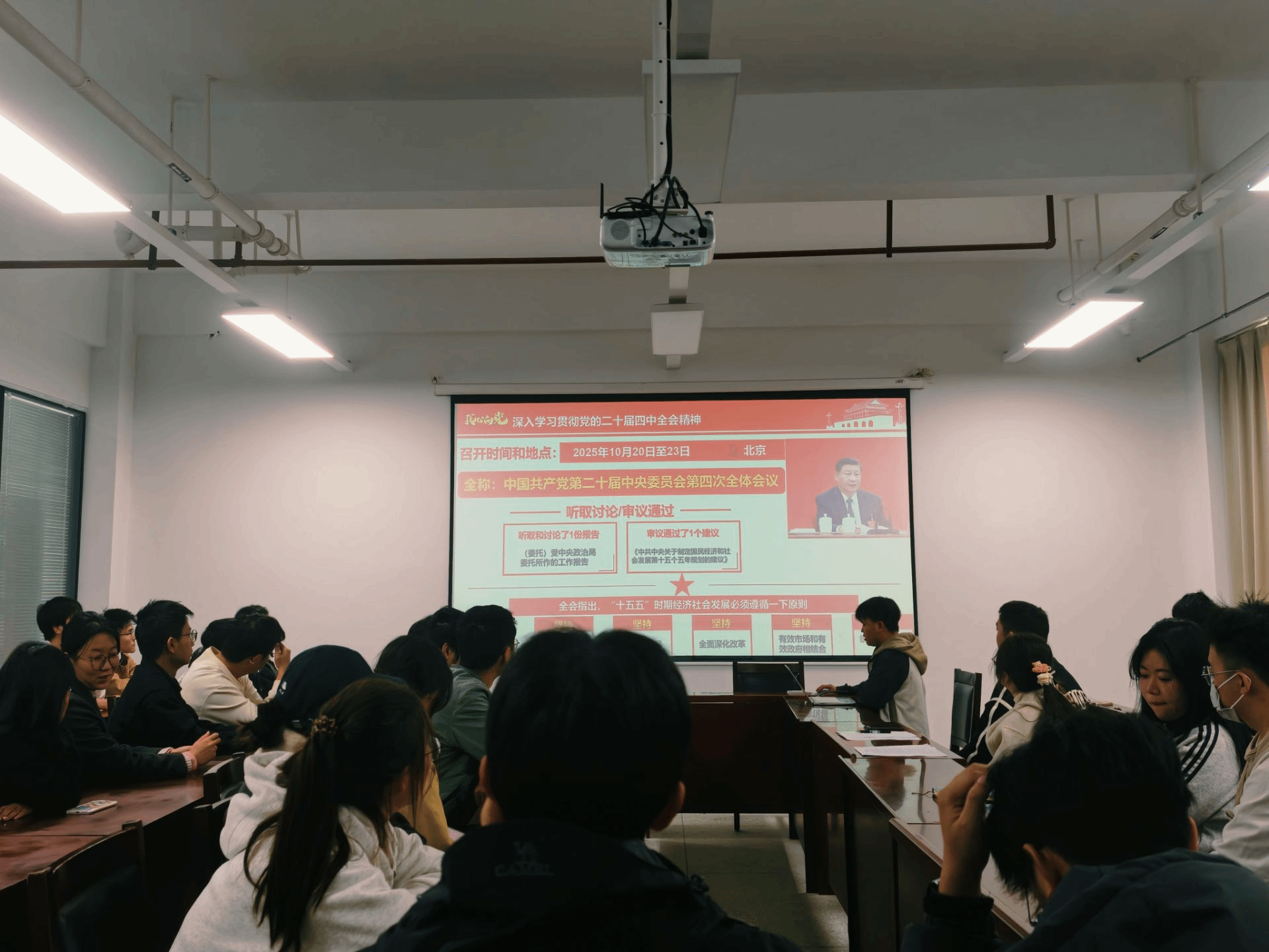 党的二十届四中全会精神学习是本次活动的重点内容。支部成员由吴明雄同志带领共同学习了全会召开的时间、地点与核心议程,精准把握了 “十五五” 时期经济社会发展必须遵循的党的全面领导、人民至上、高质量发展等六大原则,以及到 2035 年基本实现社会主义现代化的远景目标。大家一致认为,要把学习贯彻全会精神作为重大政治任务,将个人成长融入强国建设、民族复兴的伟大征程。