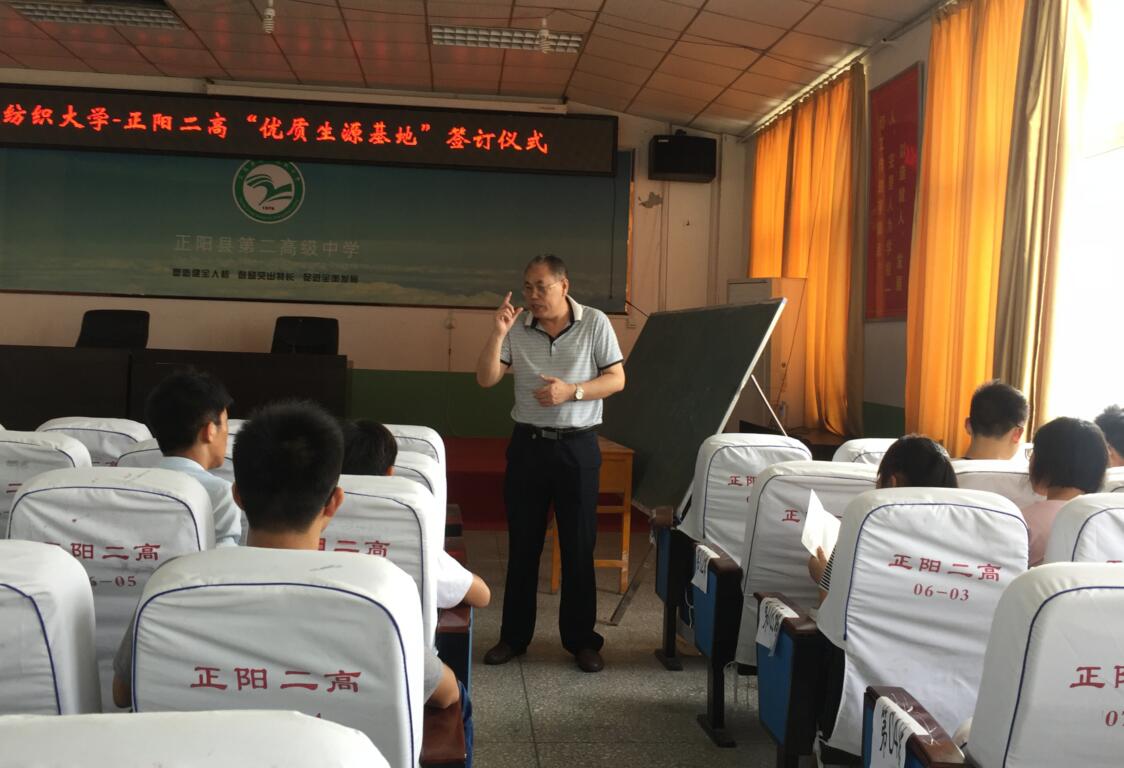 党委书记毛长文、党委副书记秦梦、材科系主任方东和办公室主任马绪亮一行4人来到河南驻马店重点高中正阳二高,双方签订了武汉纺织大学优质生源基地协议,并就2016年我校在河南招生政策相关情况做了详细交流。正阳二高党委杨书记、张校长、李副校长和教导处主任以及教师代表参加了本次仪式。