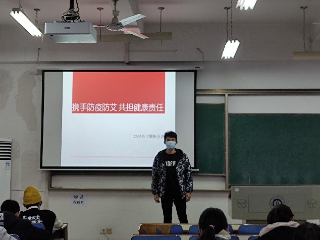材料12001班班长和支书在班会上为大家分享了艾滋病对人类正常生活造成的危害、预防艾滋病的方式、如何与艾滋病人相处等,还播放了艾滋病防治公益歌曲《红丝带》。宋乐琴同学分享了学习感悟,通过主题学习认识到预防艾滋病的重要性,也意识到大学生也需要关注艾滋病问题和关心艾滋病病人,不应该对艾滋病人存有歧视或偏见。