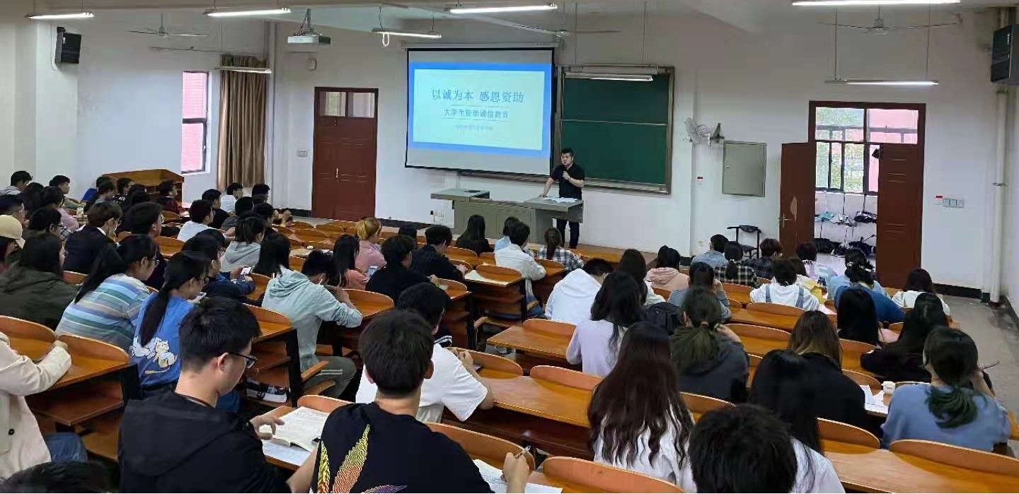 在8F-T201教室举行了“青春向党感恩资助”系列主题活动二:“以诚为本感恩资助”资助诚信教育活动。该活动分为主题教育及政策宣讲、受助学生典型事迹报告会、诚信宣誓等三个环节,整个活动由葡京娱乐场