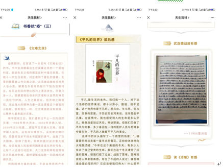 的学风建设工作,让同学们不落下宅家学习的进度,“心语心园”通过“天生我材”微信公众号开展“书香抗疫”读后感收集活动和学霸心得分享。同学们纷纷交流分享了自己宅家期间阅读书籍的读后感,学霸们则分享了关于线上学习的心得方法和读书笔记,辅导员黄鹤老师和祝捷老师频频为他们点赞打call。