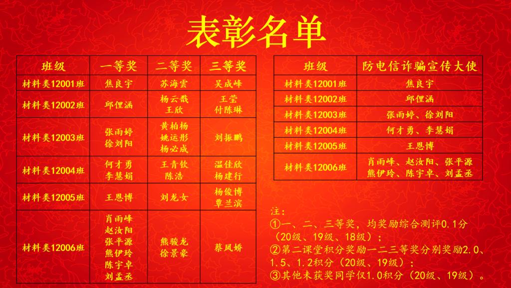 对竞赛中取得分数最高的同学颁发一等奖、二等奖、三等奖荣誉证书,并聘任一等奖获得者为所在班级“防电信诈骗宣传大使”,为班级同学开展持续防诈骗宣传服务(表彰公示详见附件)。