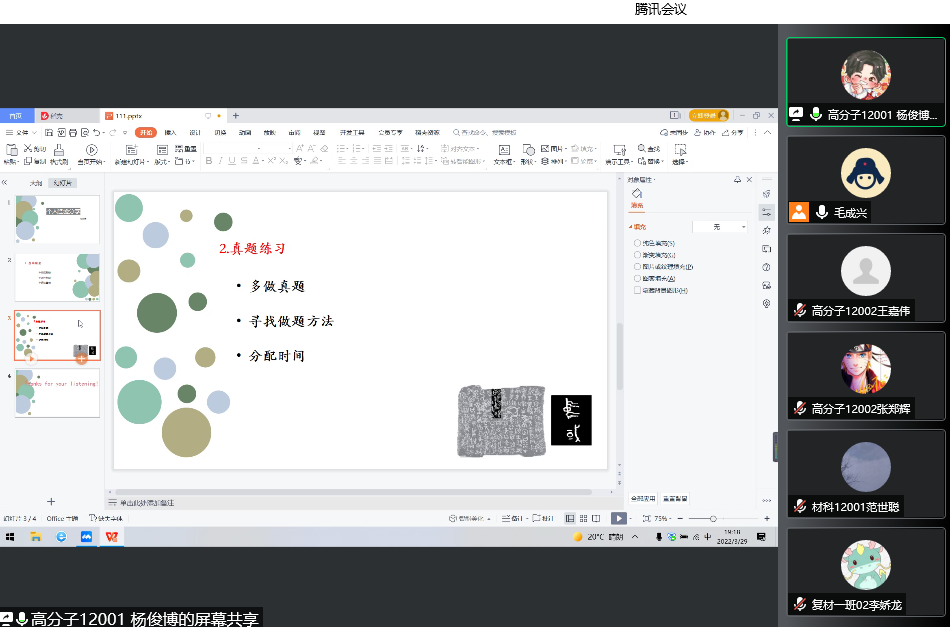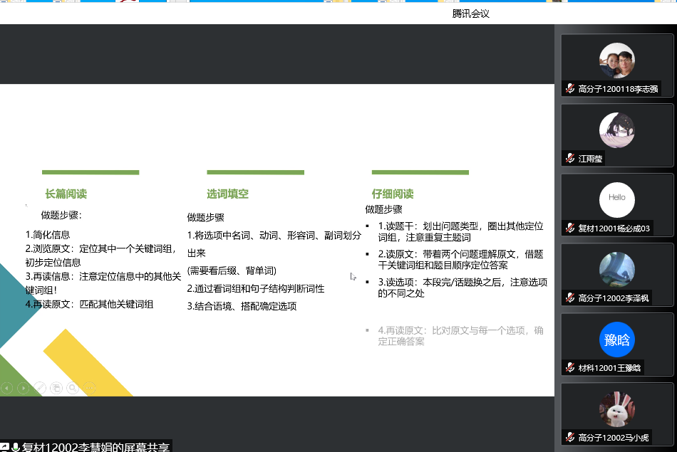 会上,各班在英语四级中取得优异成绩的6位同学做了四六级备考和应该技巧的经验分享。材科12001范世聪从听力、阅读、写作等各类题型的应试技巧方面做了详细讲解,高分子12001杨俊博强调了词汇量和真题训练的重要性,高分子12002徐玛莉分析经验的同时还以英语作文为例做了详细分解;复材12001余方韬则对四级考试进行“复盘”,针对英语基础不好的同学如何通过四六级考试分享了自己的观点,复材12002李慧娟重点分享了自己做阅读、选词填空等题目的心得体会。