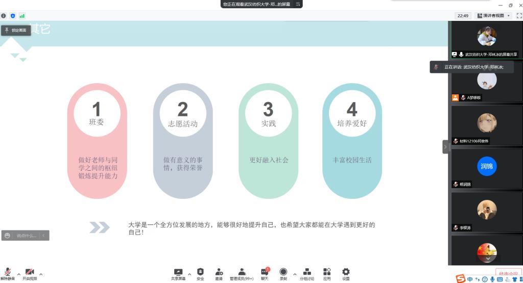 于4月17日晚在腾讯会议召开了2021级学业指导规划大会。邀请了2018级邓林冰、朱亮、李翠、张向晨作为主讲人分享大学四年的规划与收获,葡京娱乐场