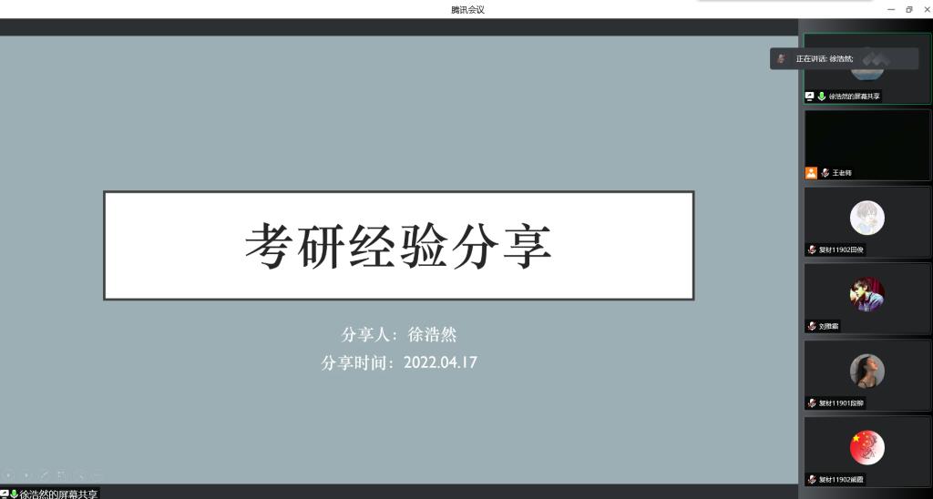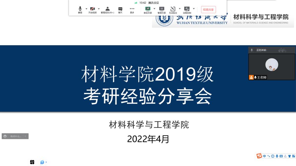 第二场考研经验分享会。邀请了2018级学生刘雅霜(376分考取武汉大学材料专业)、徐浩然(407分录取武汉理工大学材料专业)、颜梦莹(357分录取南京邮电大学材料专业)、余英杰(389分录取武汉纺织大学材料专业)主讲来分享考研经验,葡京娱乐场