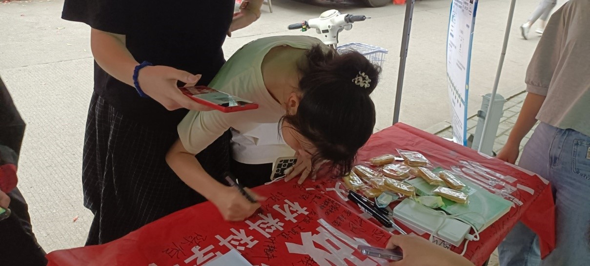 承办的武汉纺织大学2022年诚信教育主题活动的子活动在阳光校区一食堂北门拉开帷幕。本次活动分为“感恩助学 励志成才”诚信立身主题签名和助学贷款诚信教育知识竞赛两个活动,线上线下同时开展。