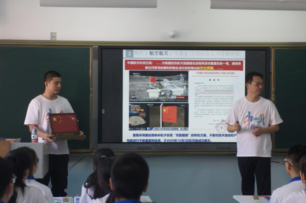 殷先泽教授为同学们带来了“小棉花大应用”专题科技讲座,殷教授介绍了武汉纺织大学及其纺织材料相关专业,鼓励大家积极报考纺大,引导同学们更加深入地探索神奇的纺织世界。随后,他详细讲解了棉花在航空航天、医用生物、可穿戴设备等各个领域的实践运用。同学们对神奇的纺织世界感到震撼,频频向殷教授提问,殷教授耐心解答,并结合同学们日常生活中的事例进行讲解。团队成员通过纺织科技展、纺织科普实验等形式进一步传播纺织知识,宣传美好纺大形象。