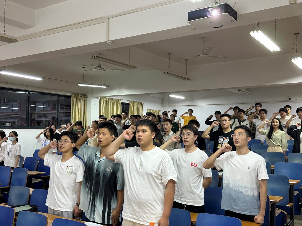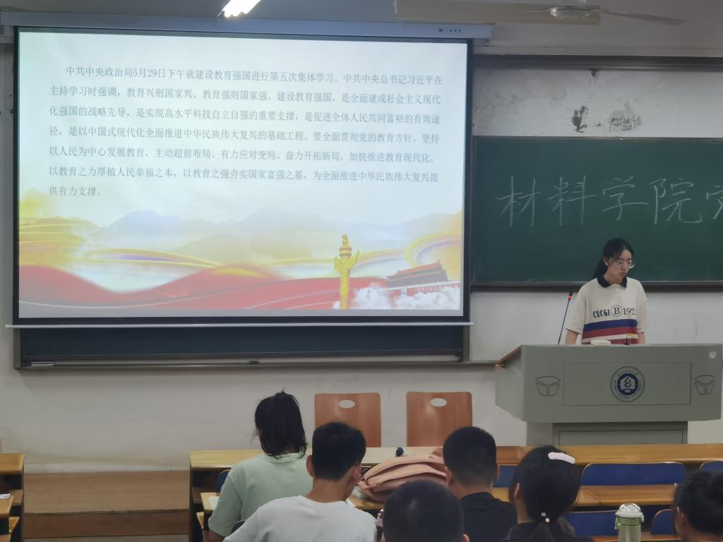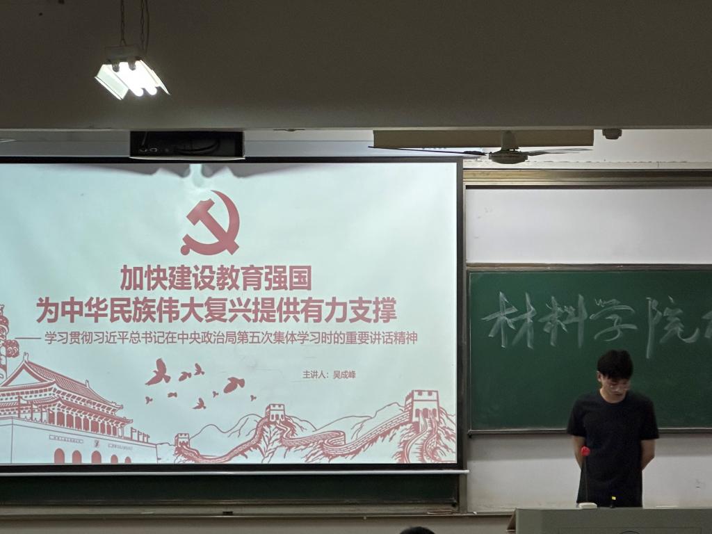 会议开始,全体成员起立奏唱国歌,重温入党誓词。随后,领学人以PPT和视频等形式分享了理论学习心得体会。材科12001吴成峰与复材12002温佳欣主讲“习近平总书记在中央政治局第五次集体学习时的重要讲话精神”,总书记要求,以教育之强夯实国家富强之基。全面落实立德树人根本任务,把高质量发展作为各级各类教育的生命线,建设教育强国是全党全社会的共同责任。