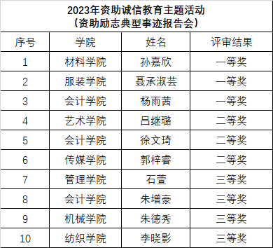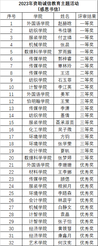 近日,由武汉纺织大学学生资助管理中心主办、葡京娱乐场 承办的2023年学生资助诚信教育主题活动之“一封感恩书信”和“一次资助励志典型事迹报告会”评审工作顺利开展,经评议,结果如下。