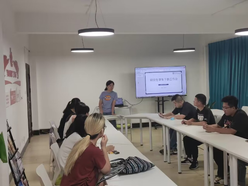 在7栋“纺大研思”工作室召开研究生学生干部培训会暨迎新工作安排会,辅导员曾玉竹、胡晓,全体研会干部、班委参加会议。