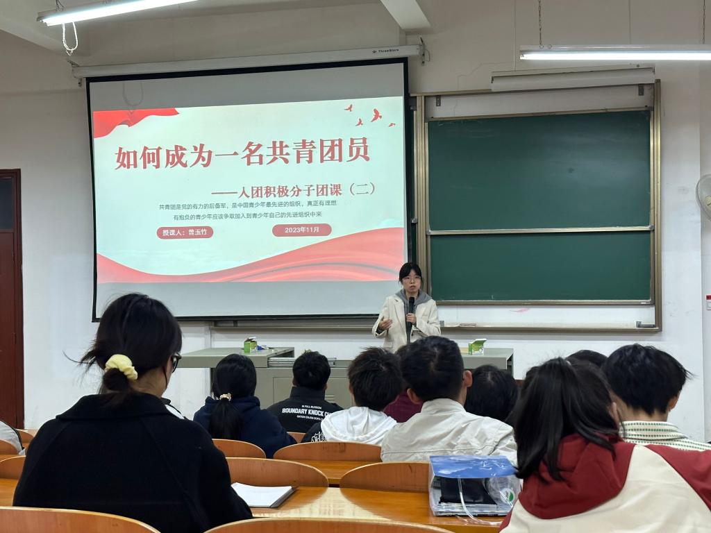 团员发展要求,详细地讲解了团员发展的流程及要求,特别介绍了入团积极分子培养考察和综合评价制度、发展对象预审和公示制度、发展团员工作情况核查制度等规范性制度。此外,曾老师鼓励大家积极地参加活动,要以一名合格团员的标准来要求自己,坚定理想信念、端正入团动机,提升自身本领,努力拼搏奋斗。最后,曾老师对同学们的提问进行了耐心解答,暖心地鼓励大家要学会去勇敢地面对一切困难。
